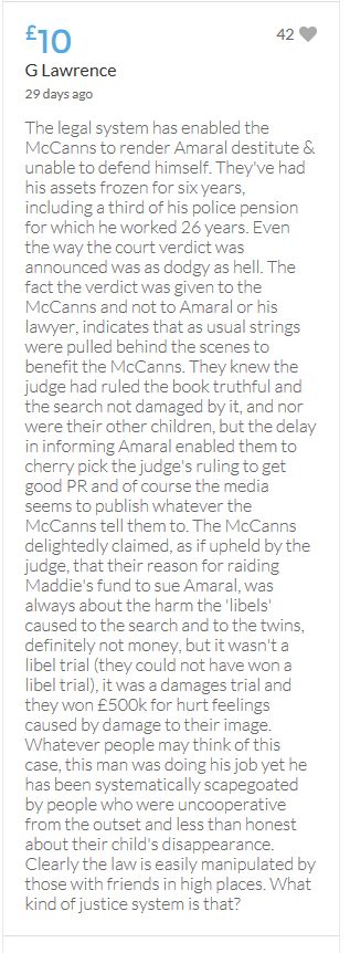 Never should the ill treatment of children be rewarded. Never should lies be rewarded. The McCanns have been rewarded on each count. Never should truth be silenced. Never should freedom of expression be suppressed. Never should books be banned. The McCanns are guilty on each count. Never should a Judgement fall on the side of those who have the greater power, the greater financial means to pursue an action. The McCanns use that which was generously given for Madeleine to bring harm to others. No matter what I believe became of this wee girl. My donation is for Goncalo Amaral to fight the injustice and hatred the McCanns have brought into his life. Every copper in the land should be supporting Goncalo. Good wishes being sent G.Amaral's way.
